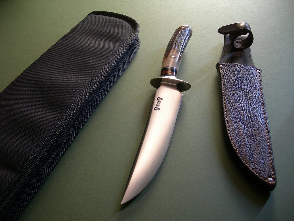 8 photos for review – as shown, a new black canvas carry case is included. This is a great price one one of Jim’s fighters, where else can you find a completely hand made, hand forged knife and custom sheath under $100 per blade inch? You can’t… this is a bargain! Sure to appreciate in price at some point down the road, grab what you can and tuck them away for long term investment purposes Thanks and good luck.