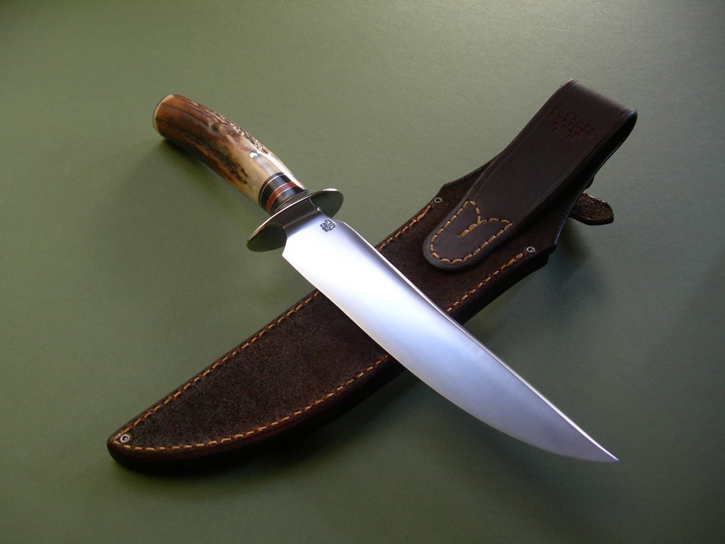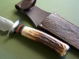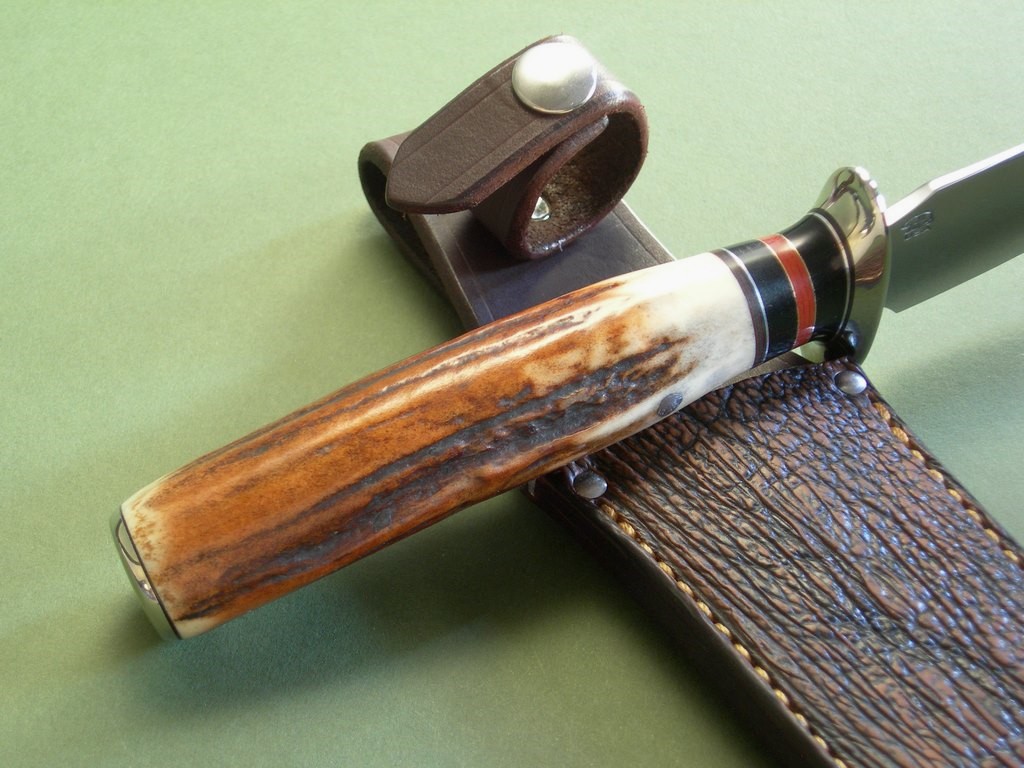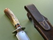 A beautiful, old school stag fighter made by Jim Behring. Brand new from the maker, unused and in perfect condition. Razor sharp edge, nickel silver hardware as bookends to a short spacer stack and fabulous looking sambar stag handle Super fast in hand, made from 1/8” stock with really nice balance Overall length is right at 12-1/2”.