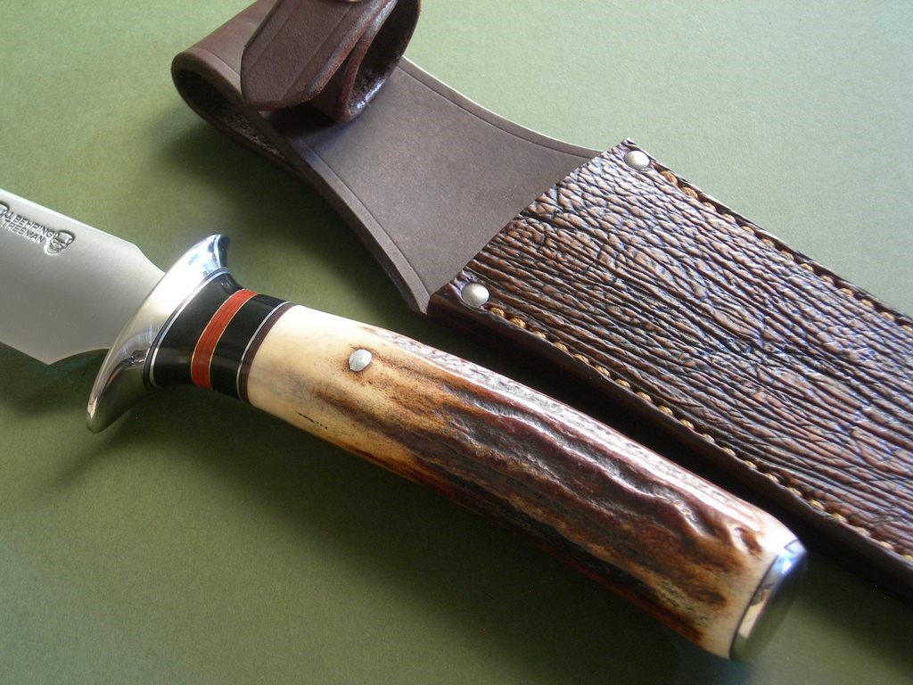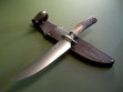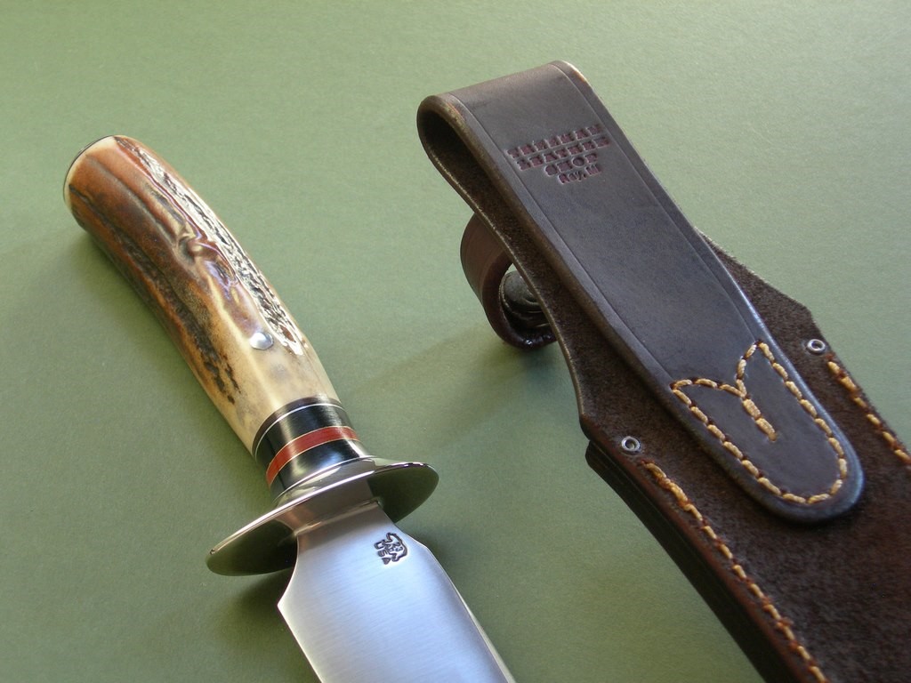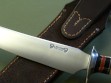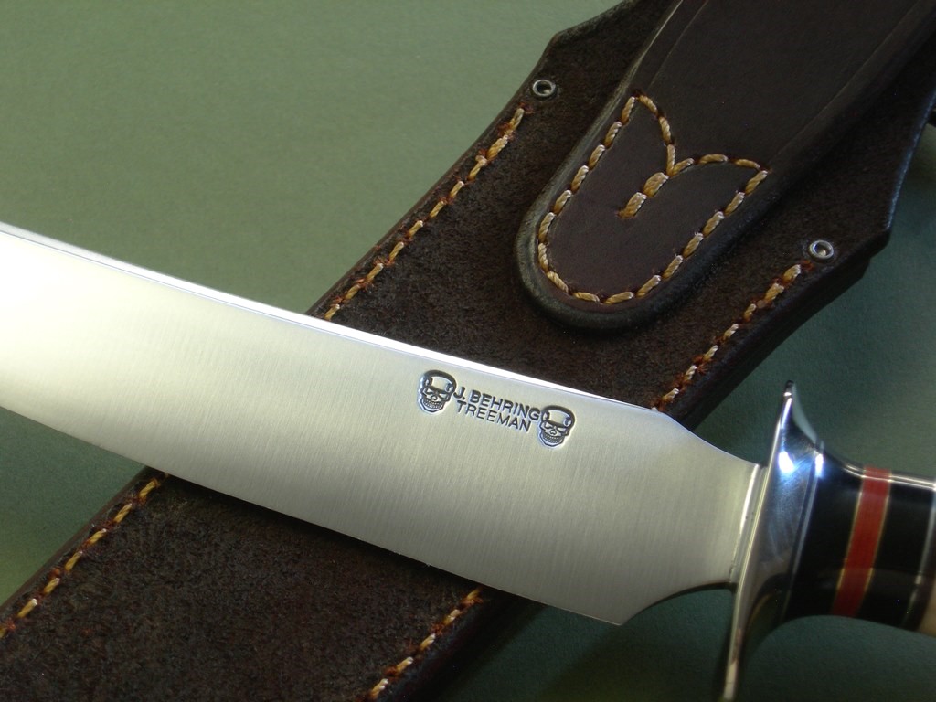 The knife is fitted to a custom riveted roughback sheath made at the Treeman shop. Treeman Leather Shop stamp on the back belt loop and a really sweet shark skin front panel. Brand new, just a rub or two at most.
