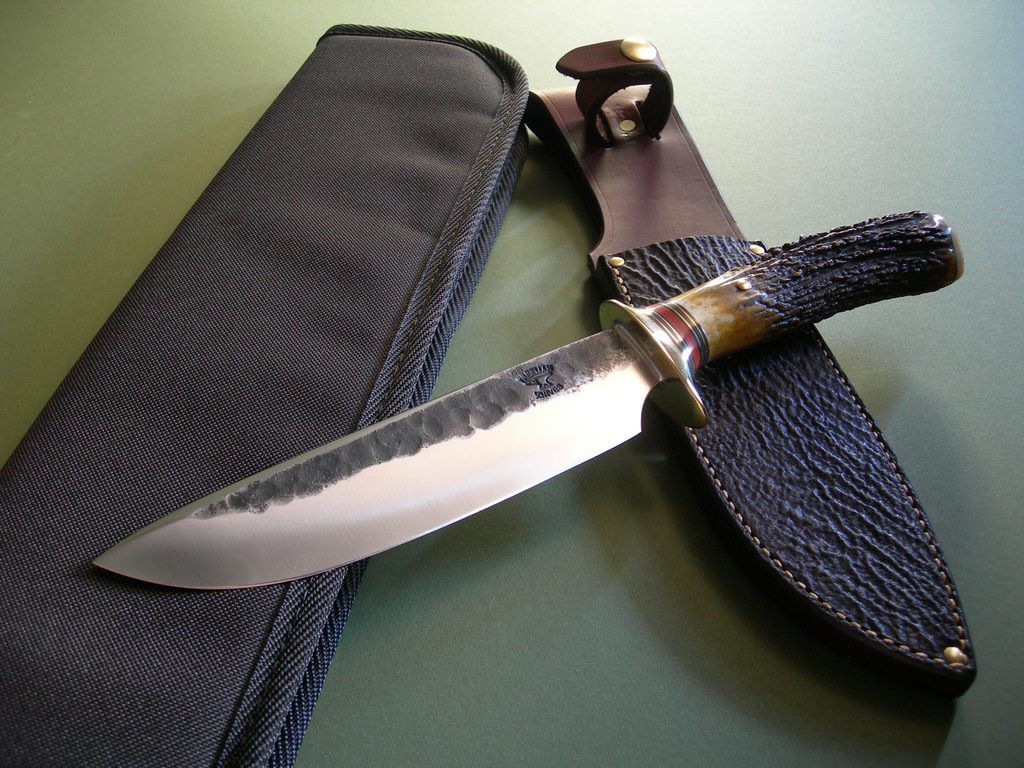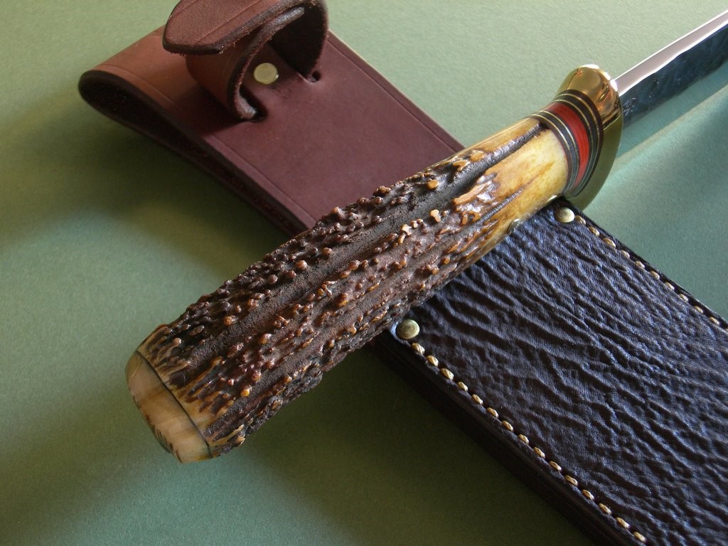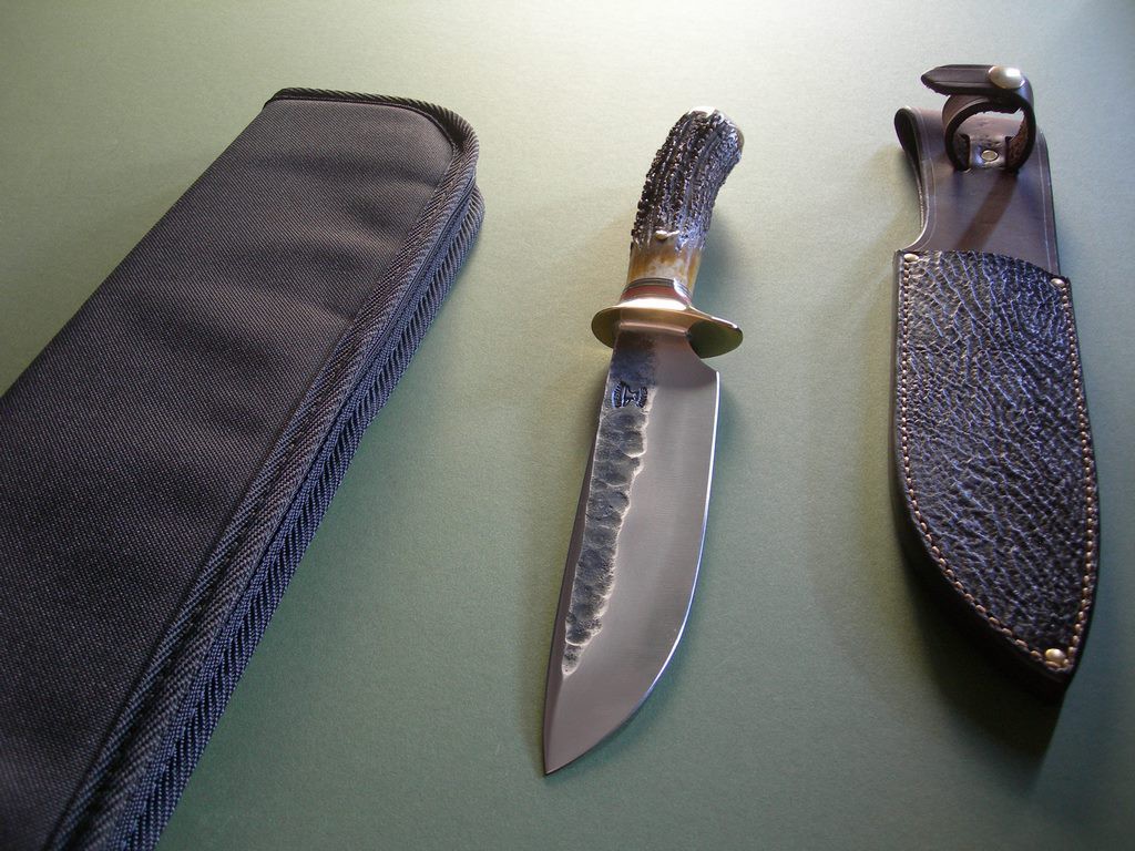 7 photos for review – as shown, a black canvas carry case is included. This would be a perfect knife to have at the campsite, great for hunting or all around camp use. It’s a beautiful knife, the stag on this one is second to none. Thanks and good luck.