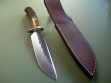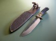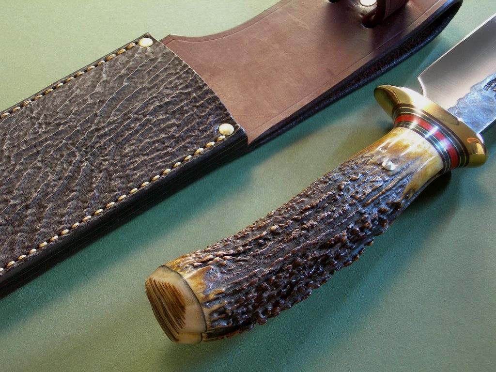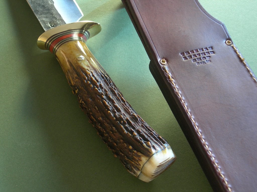 Summary: this is a brand new custom hammer marked drop point hunting knife made by Jim Behring. Jim fitted the knife with a silver soldered brass guard, a very nice color pattern on the short spacer stack. The pinned stag is deep cut and exceptional, the thick Musk Ox butt completes the knife. Mint condition.