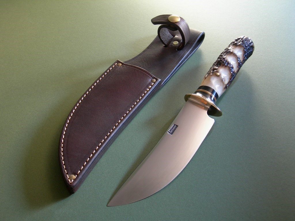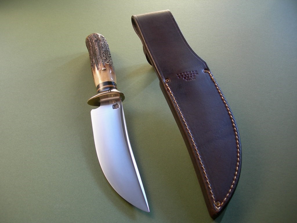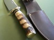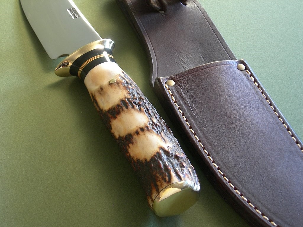 Summary: this is a fabulous looking fingered stag hunter with 6" tool steel blade, silver soldered brass guard, short spacer stack and right hand fingered deep cut dark stag handle. A fitted brass butt cap completes the knife. The stag on this knife is gorgeous, overall length right at 11-1/4”. Mint condition… and it’s sharp!