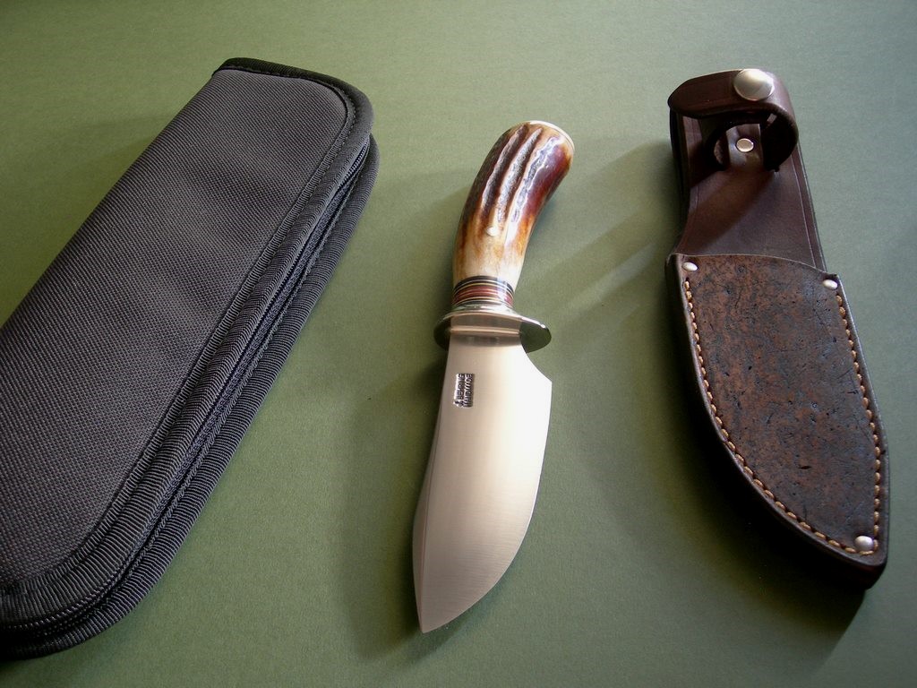 9 photos for review – as shown, a new black canvas carry case is included. This would be a great knife to have on your belt for hunting or all-around camp use, obviously a great knife to tuck away for collection purposes. Love the thin stock on this one, light in hand and a super slicer! Thanks and good luck.