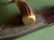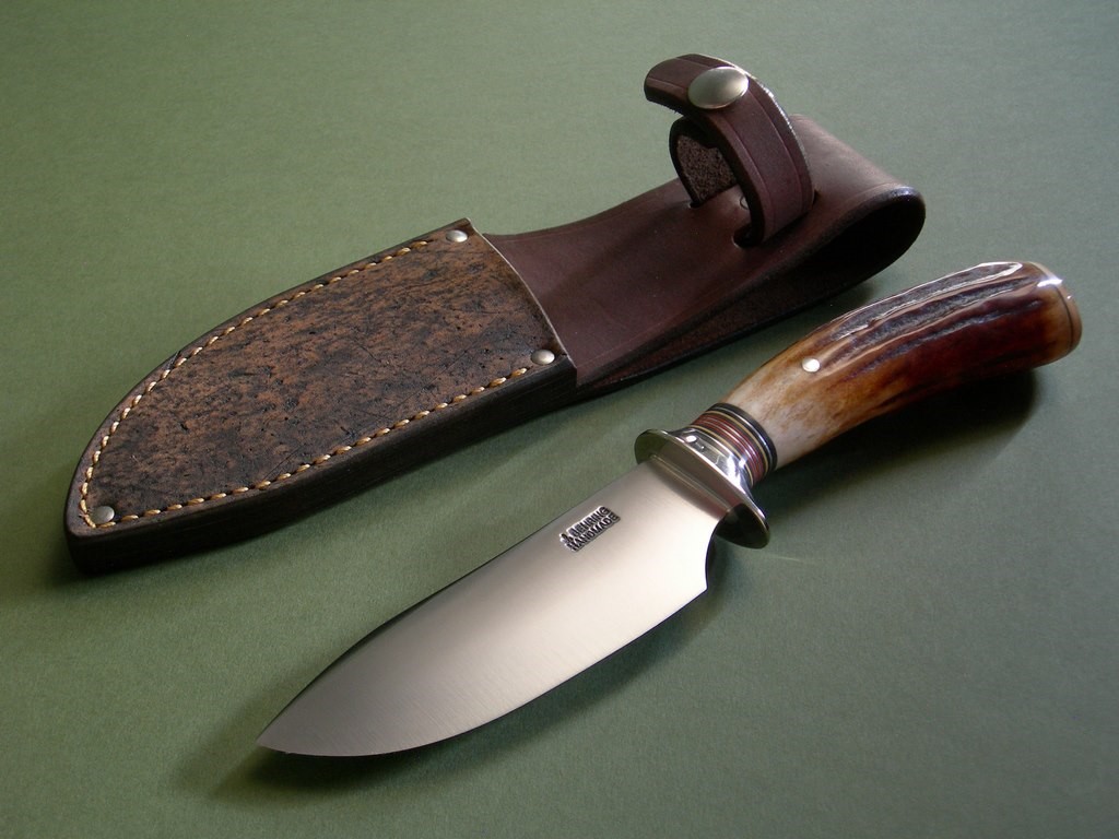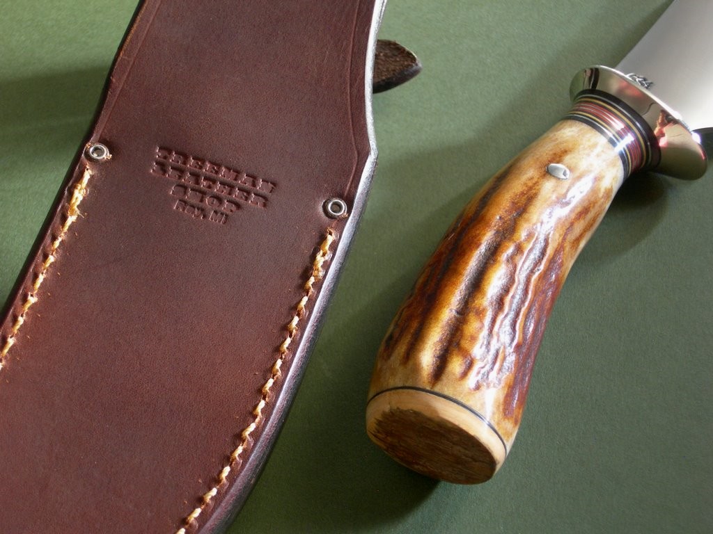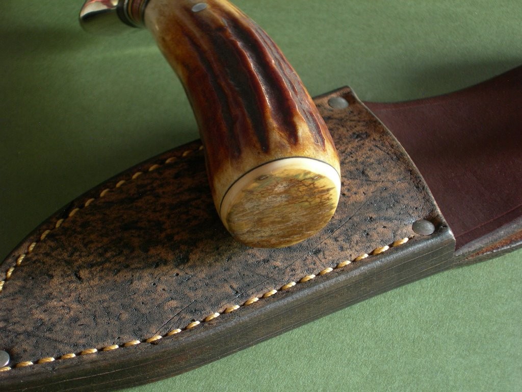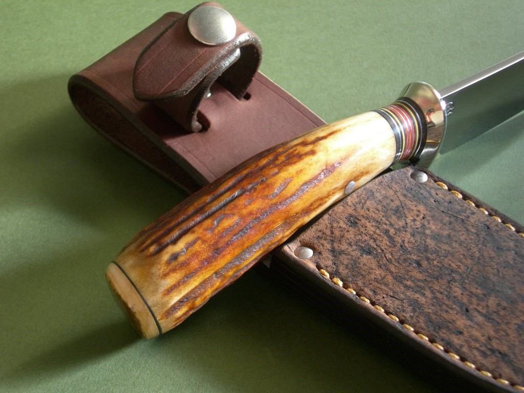 This knife has a 4.25" hand forged blade made from 1095 steel. Thin stock (1/8”), made with a silver soldered nickel silver guard, short spacer stack, great looking 120 year old caramel colored German stag and a fitted / finished mammoth ivory butt plate. Overall length is right at 9", this knife is brand new and in mint condition.