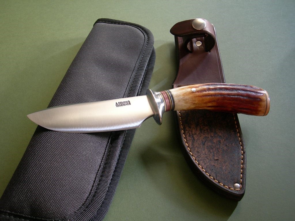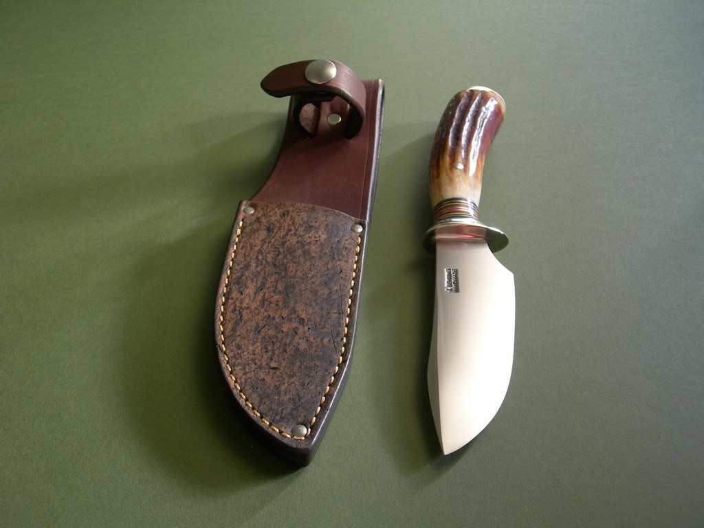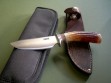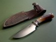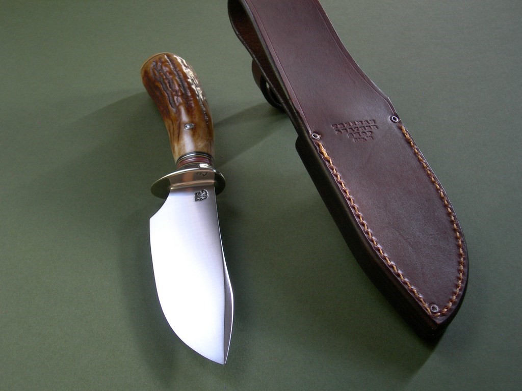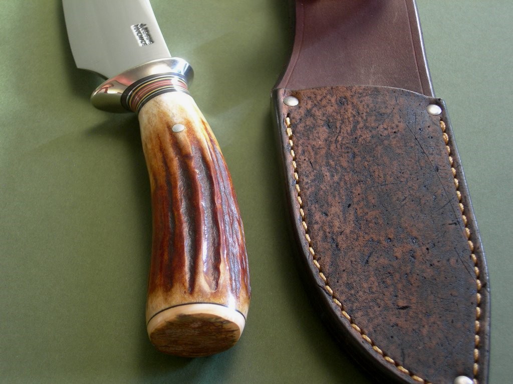This knife has a 4.25" hand forged blade made from 1095 steel. Thin stock (1/8”), made with a silver soldered nickel silver guard, short spacer stack, great looking 120 year old caramel colored German stag and a fitted / finished mammoth ivory butt plate. Overall length is right at 9", this knife is brand new and in mint condition.