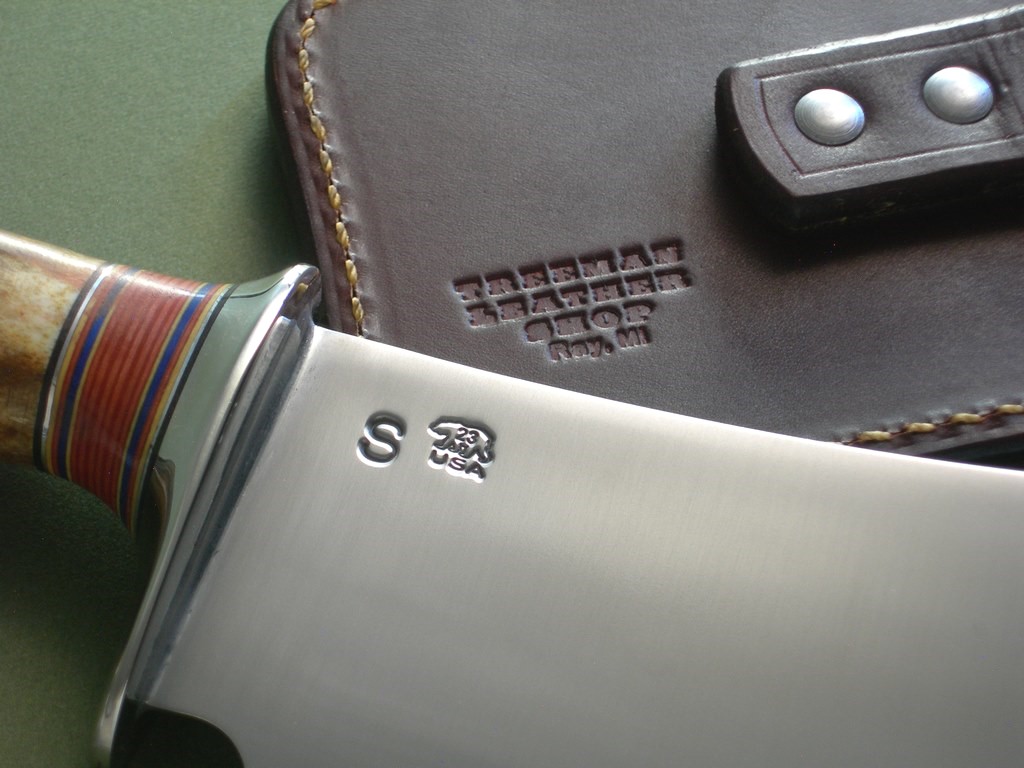 They made the custom belt sheath right there at the shop and fronted it hide. All stitched, no rivets except for the belt loop. The cleaver / sheath fit is perfect and the sheath is in mint condition.