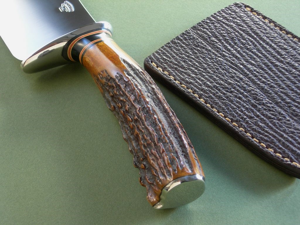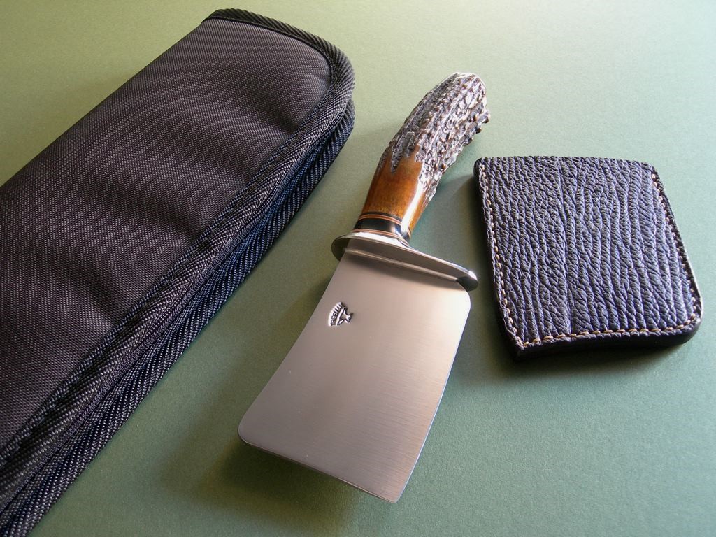 6 photos for review – I’ll pack it carefully in the carry case shown. This is a really neat, custom piece.. I have two of these and both have awesome stag and slightly different sheaths. (I prefer this one as it’s perfect for back pocket carry) As an investment for your collection.. you can’t lose. If you’re buying it to use... you can’t lose. Get the picture? You can’t lose!! Chop chop!! Thanks and good luck.