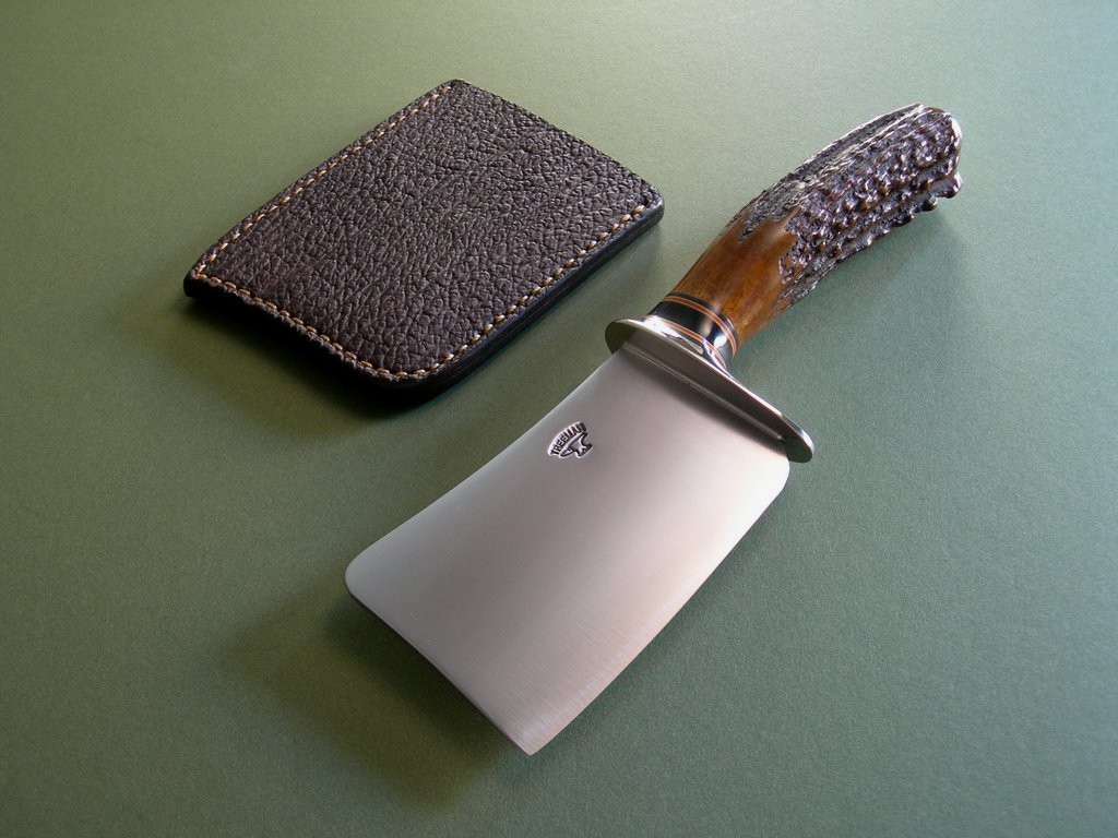 The custom slip sheath with front side shark panel was made right there at the shop. All stitched, no rivets. The cleaver / slip sheath fit is perfect and the sheath is in mint condition.