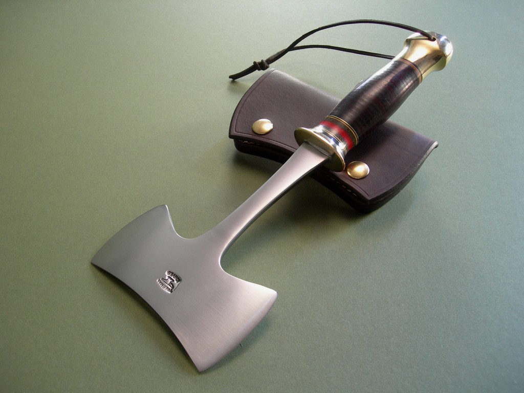 This is a rare, fully functional hatchet with large handle and 2-1/2" cutting edges. Lanyard at the butt end so it's not going to fly outta your hand. Brand new, purchased directly from Jim.