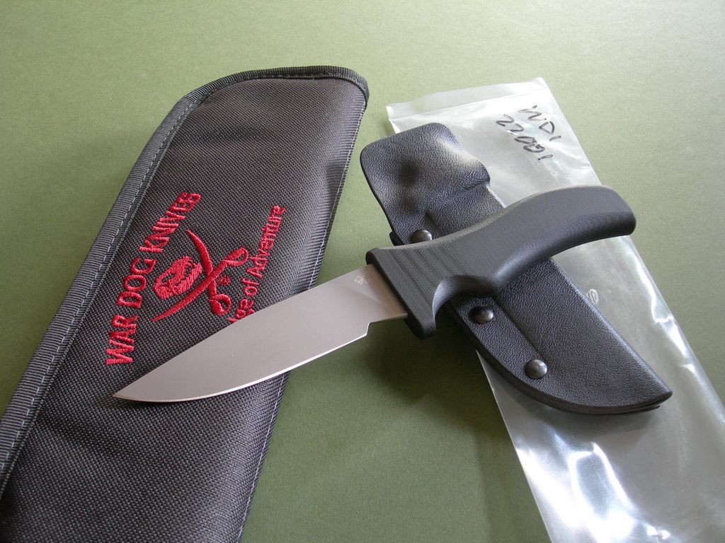 Summary: War Dog Knives Model 1, I have serial #’s 4 and 6 for sale. These War Dog Knives come right out of the Mad Dog Knives shop under the War Dog Knives branding, production knives (yet still custom) made with cryogenically treated 440C stainless steel blades with a 55-57 RC. Made from 1/8” stock and razor sharp, War Dog etching on the front ricasso and numbered on the back. Overall length is 8-1/8”, mint condition.